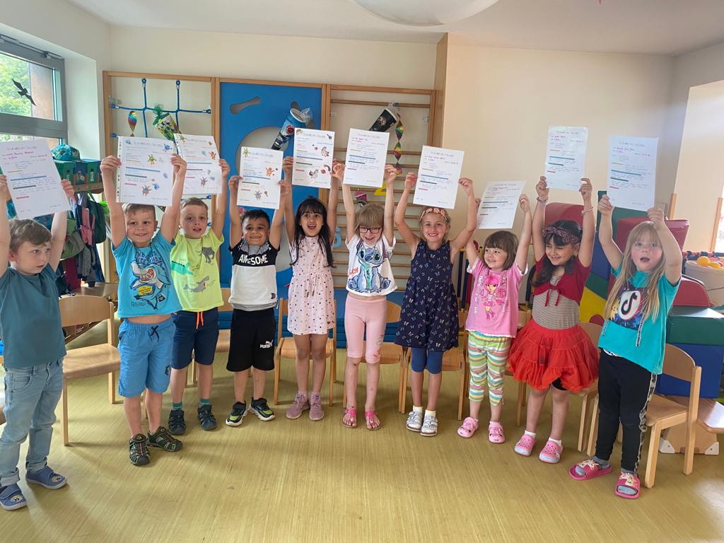 Los ging es am Montag mit der Ausgabe der „Kindergartenzeugnisse“ an unsere Vorschüler. Die großartigen Leistungen, ihre Stärken und ihre wunderbaren Besonderheiten wollten wir so noch einmal besonders würdigen.